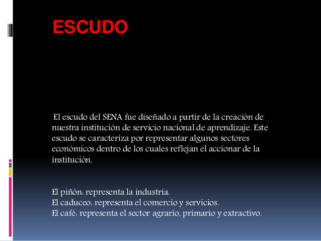 2. 2. ESCUDO El escudo del SENA fue diseñado a partir de la creación de nuestra institución de servicio nacional de aprendizaje. Este escudo se caracteriza por representar algunos sectores económicos dentro de los cuales reflejan el accionar de la institución. El piñón: representa la industria. El caduceo: representa el comercio y servicios. El café: representa el sector agrario, primario y éxtractivo