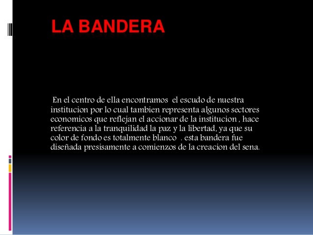 3. 3. LA BANDERA En el centro de ella encontramos el escudo de nuestra institución por lo cual también representa algunos sectores económicos  que reflejan el accionar de la institución , hace referencia a la tranquilidad la paz y la libertad, ya que su color de fondo es totalmente blanco . esta bandera fue diseñada precisamente a comienzos de la creación del sena.